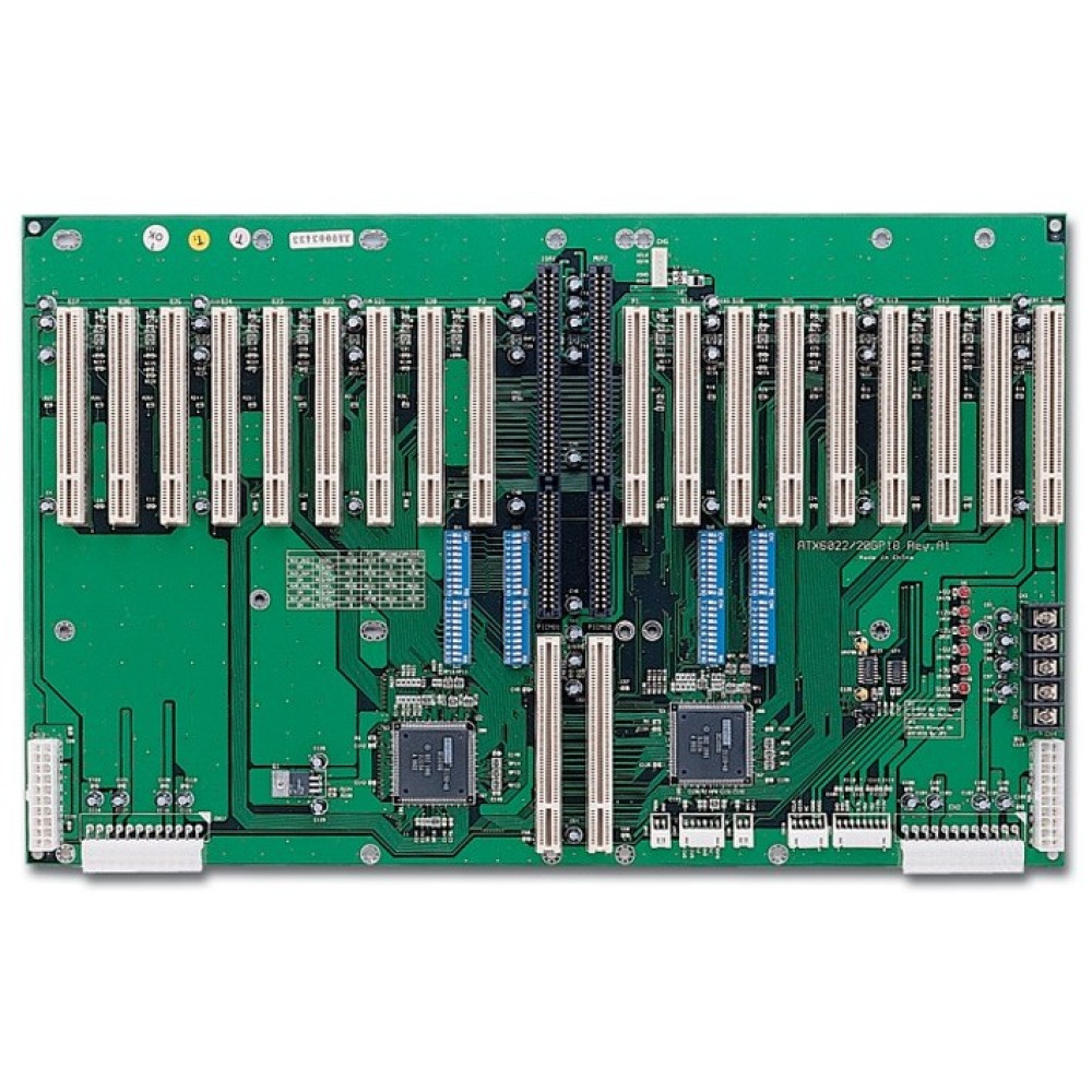 The ATX6022/20GP18 is a 20-slot, ATX-supported, bridged PICMG (Peripheral Component Interconnect and Message Passing) active backplane designed for industrial PCs. It provides one PICMG slot, 18 PCI slots, and one ISA slot, and is compatible with the AX61492 chassis. This backplane supports both AT and ATX power supplies. It is compatible with the AX61492 Axiomtek chassis.