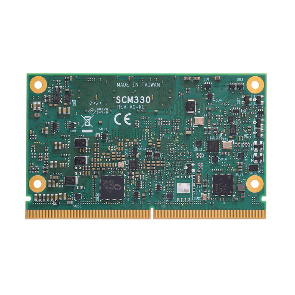 Featured here is the SCM330 SMARC 2.1.1 system-on-module. It has a tiny 82 x 50 mm form factor and is available with the Intel Core/Pentium/Celeron or Intel Atom processors x7000 series. It is equipped with soldered LPDDR5 RAM operating at 4800 MT/s and includes an onboard eMMC 5.1 flash module. The robust module features a wide range of interfaces including three PCIe x1, 8 USB ports, two Ethernet ports at 10/100/1000/2500 Mbps for network connection, HDMI and DisplayPort video, SDIO, UART, LVDS, and GPIO. It supports CANbus, SPI, I2C, and eSPI buses.