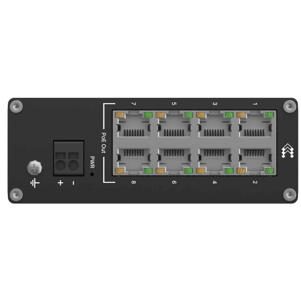 The TSW040 is an unmanaged 8-port PoE+ switch by Teltonika, featuring eight RJ45 ports with a total power budget of 240 W, or up to 30 W per port. This compact and rugged 8-port switch also features a 2-pin power input and an integrated DIN rail for easy mounting, making it ideal for industrial applications. The TSW040 has a wide voltage range of 7-57 VDC and a PoE-out voltage range of 44-57 VDC. The switch itself has a wide voltage range of 7-57 VDC.