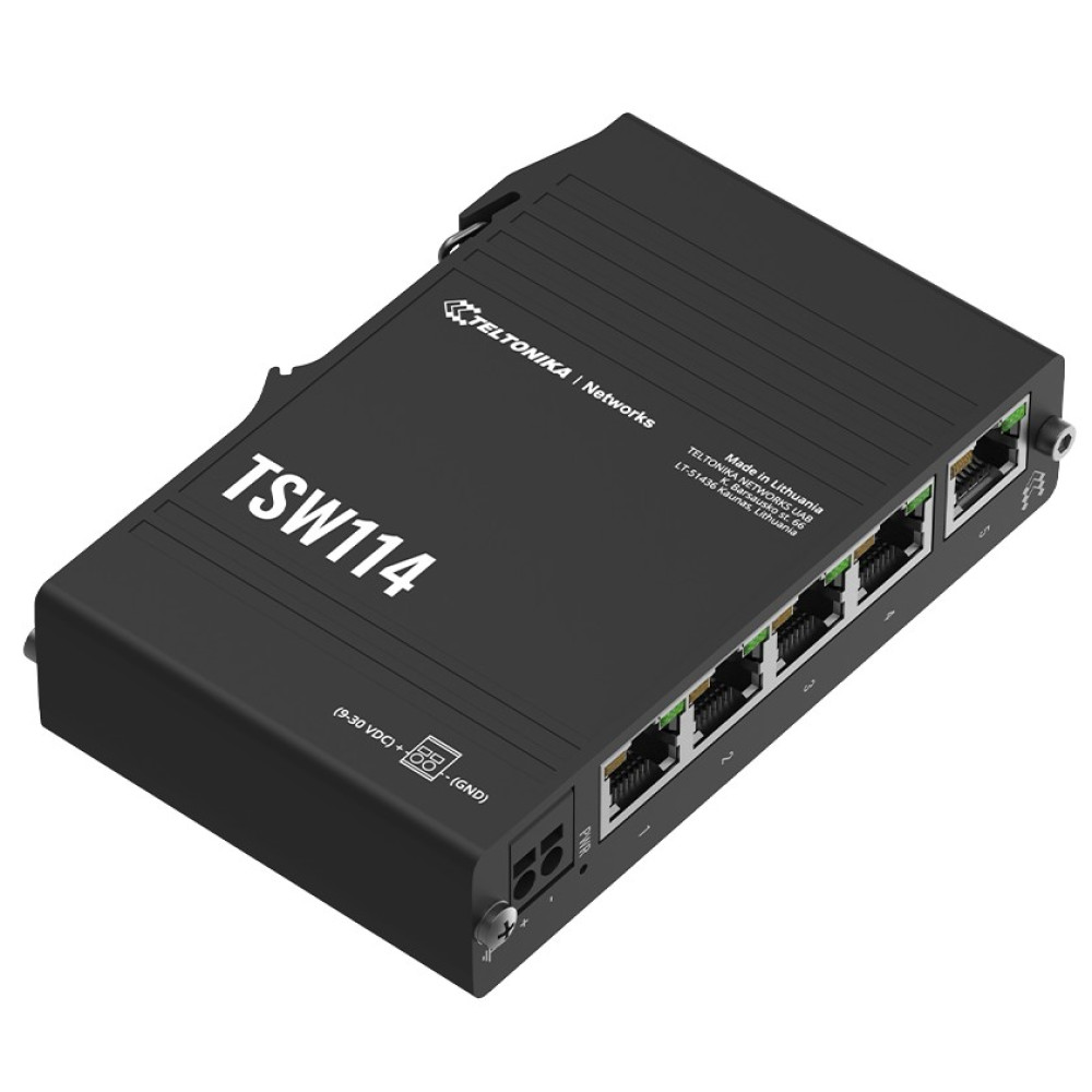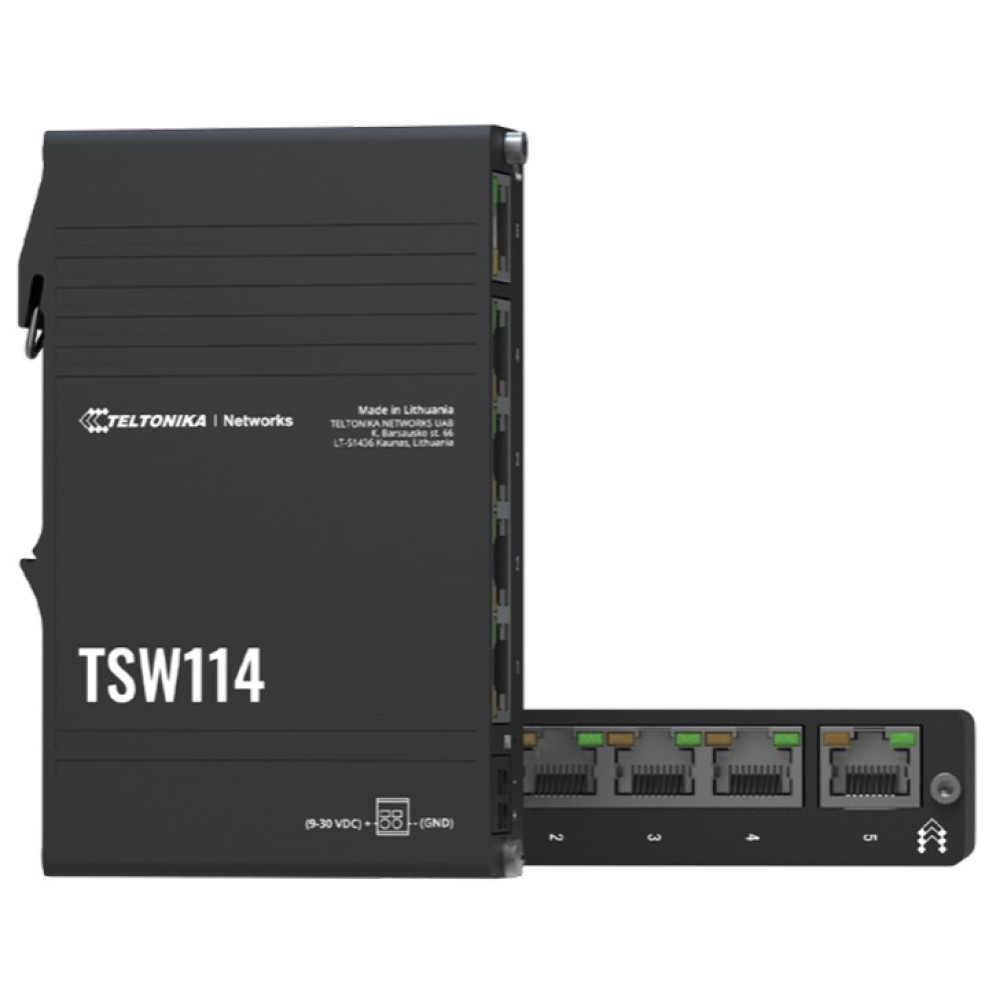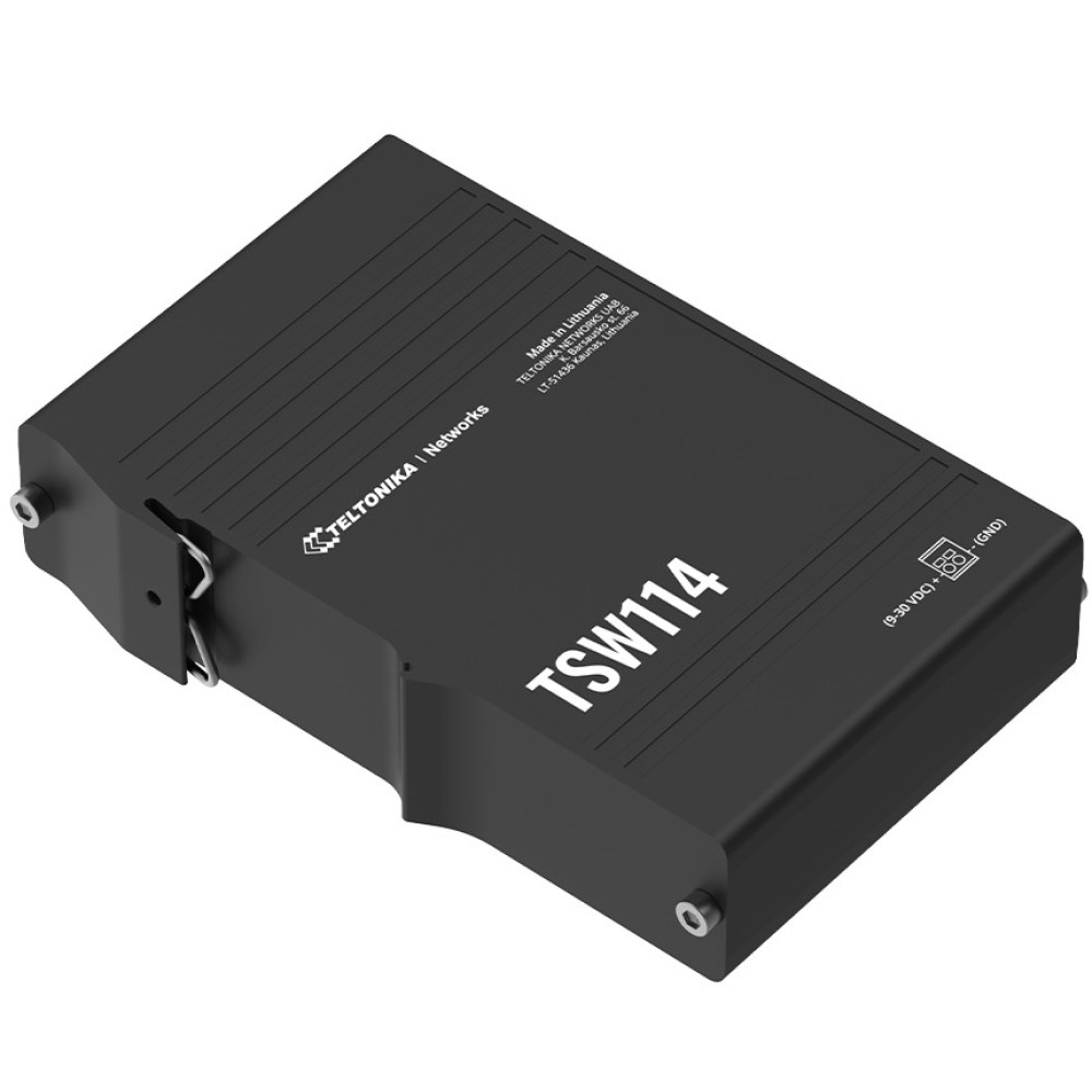 The TSW114 is ready to comply with existing connectivity, deploying, and space factors because it comes with an integrated DIN rail bracket that makes device installation very easy, quick, and, most importantly – convenient. The switch is equipped with 5 Gigabit Ethernet ports, a 2-pin DC socket, and a grounding screw right next to it for enhanced device protection. All of these features are front-facing, meaning all wires can be plugged into one side of the device, making any solution instantly scalable. Multiple TSW114 switches can be placed side-by-side, taking very little space while supporting robust network connectivity. It’s also noteworthy that the TSW114 has a wide range of power supply voltages (9-30 V) and can take power from cables without needing additional wiring or power plugs.