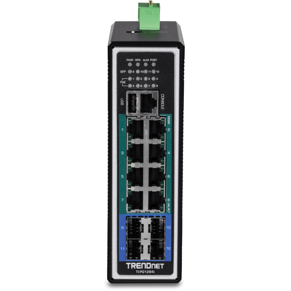 TRENDnet's TI-PG1284i 12-Port Industrial Gigabit L2+ Managed PoE+ DIN-Rail Switch offers advanced layer 2 managed features with enhanced traffic controls to meet the evolving demands of today's SMB networks. The switch is equipped with an IP30 rated metal enclosure, designed to withstand a high degree of vibration and shock, while operating within a wide temperature range of -40° - 75° C (-40° - 167° F) for industrial environments. The TI-PG1284i industrial layer 2 managed switch features eight copper Gigabit ports for high-speed device connections, and four SFP slots that support 1000Base-FX modules for long distance fiber networking applications.