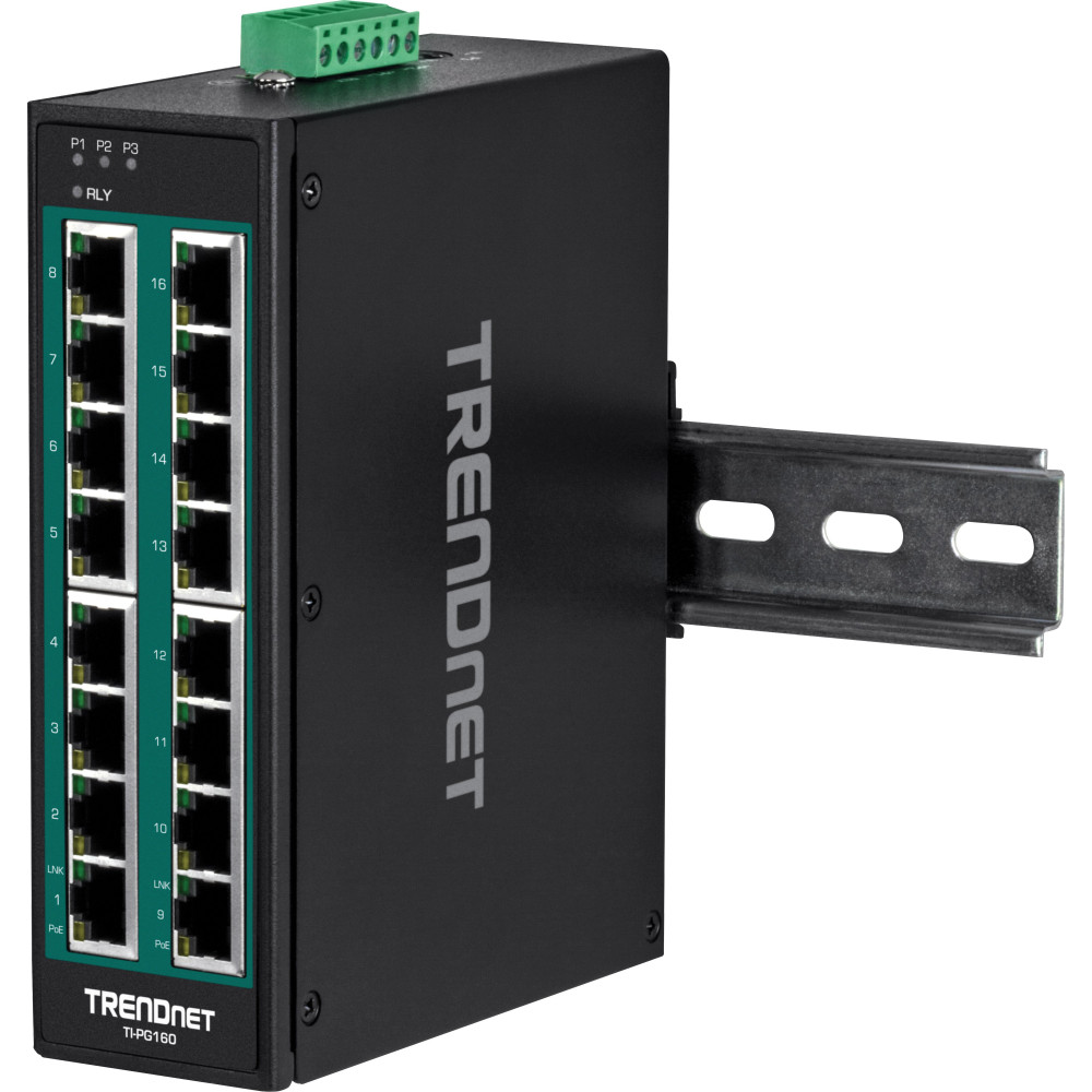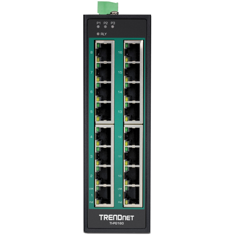 The TI-PG160 16-Port Industrial Gigabit PoE+ DIN-Rail Switch has sixteen gigabit PoE+ ports with a 240W PoE power budget. Users are able to connect sixteen PoE+ devices to the industrial PoE switch, while still providing two gigabit ports for additional network connections. The industrial PoE switch is equipped with an IP30 rated metal enclosure, designed to withstand a high degree of vibration and shock, while operating within a wide temperature range of -40° - 75° C (-40° - 167° F) for industrial environments.