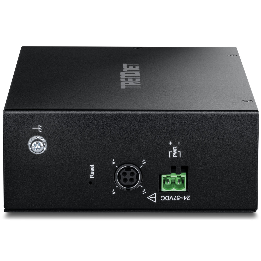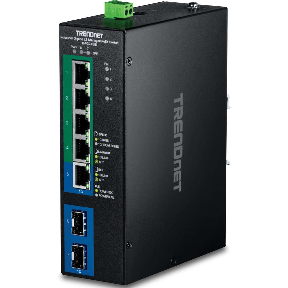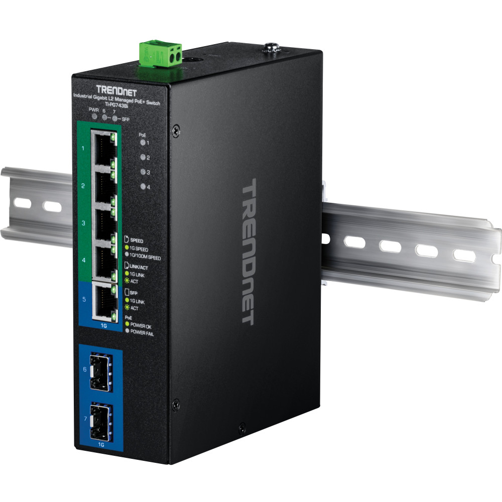 TRENDnet's TI-PG743Bi 7-Port Hardened Industrial Gigabit PoE+ Layer 2 Managed DIN-Rail Switch features four Gigabit PoE+ ports with a 120W PoE budget, one gigabit port, and two SFP ports that support both 100Base-FX and 1000Base-FX modules for long-distance fiber applications. The hardened network switch is equipped with an IP40 rated metal enclosure, designed to withstand a high degree of vibration and shock, while operating within a wide temperature range of -40° - 75° C (-40° - 167° F) for industrial environments. Advanced traffic management controls, troubleshooting, and SNMP monitoring support make this managed PoE+ switch a powerful solution for SMB networks.