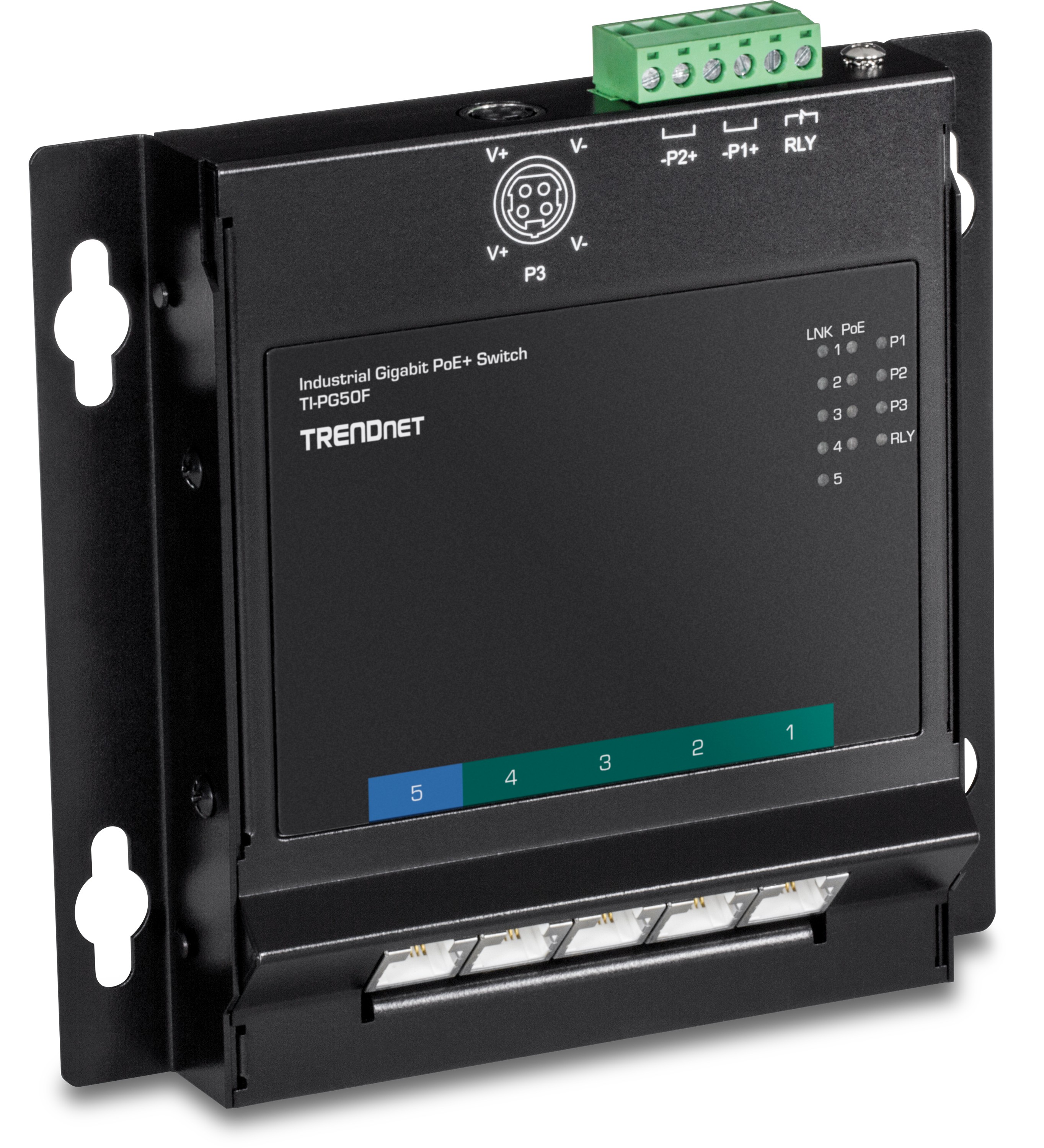 TRENDnet TI-PG50F 5-Port Industrial Gigabit PoE+ Wall-Mounted Front Access Switch